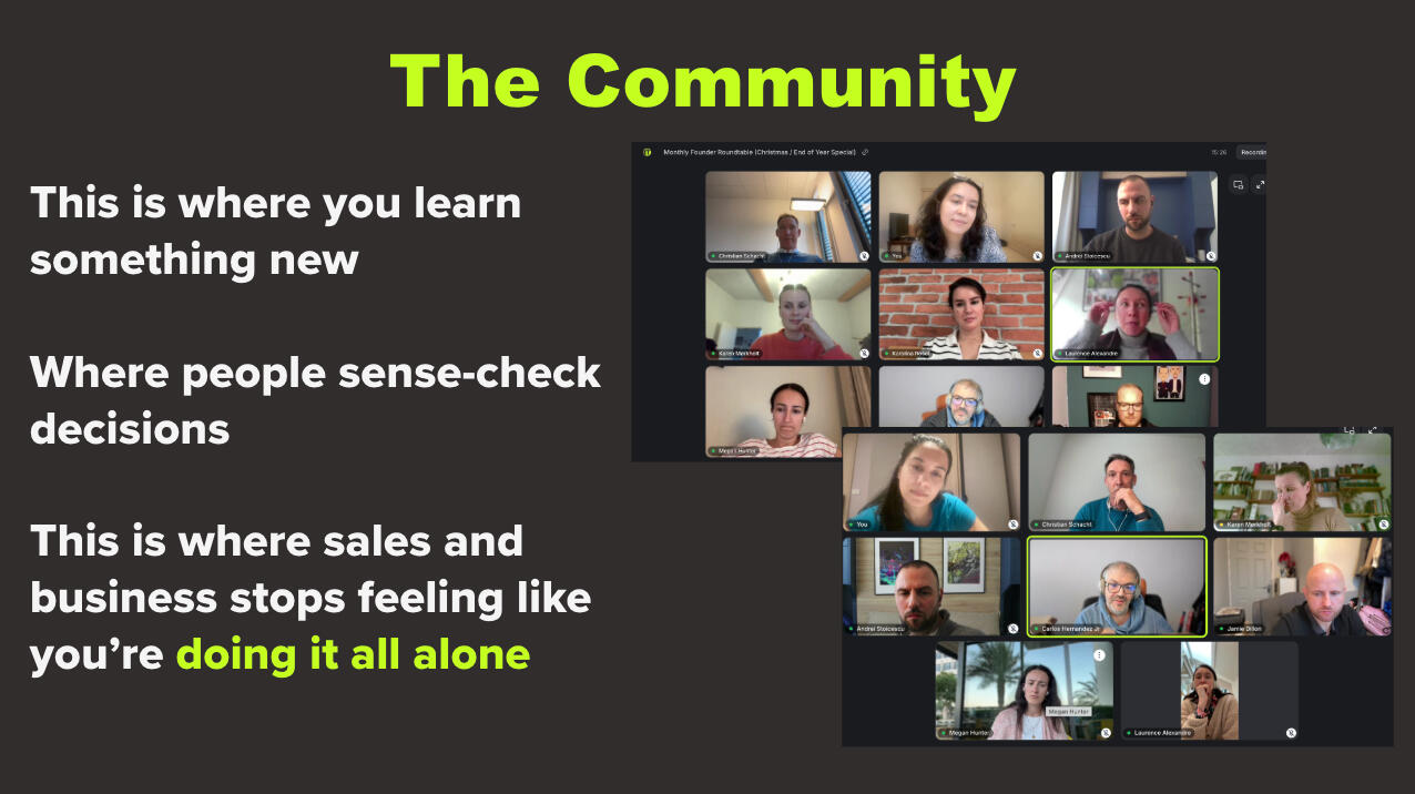 Learn from successful founders, sales and marketing experts who know actually works. Ask questions, get frameworks, and see behind-the-scenes strategies books on their own can't teach you.